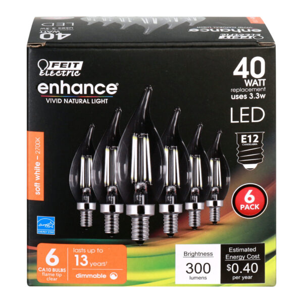 Feit CFC40/927CA/FIL/6 40W Equivalent 3.3W 300 Lumens 2700K Filament Flame Tip Candelabra Base Dimmable LED Light Bulb 6 Pack