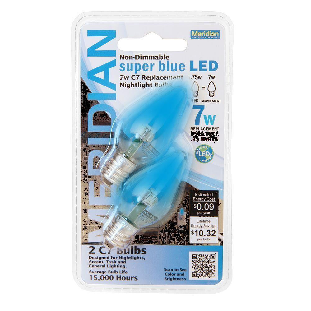 Meridian 7w equivalent C7 LED replacement nightlight bulbs (2-pack) are cool to the touch, long lasting and energy efficient, using only .75w of electricity compared to a 7w incandescent bulb. These LED replacement bulbs have the traditional C7 shape with a candelabra base and provide a bright blue or green omni-directional light. Designed for use in nightlights, appliances, accent, task and general purpose lighting.
